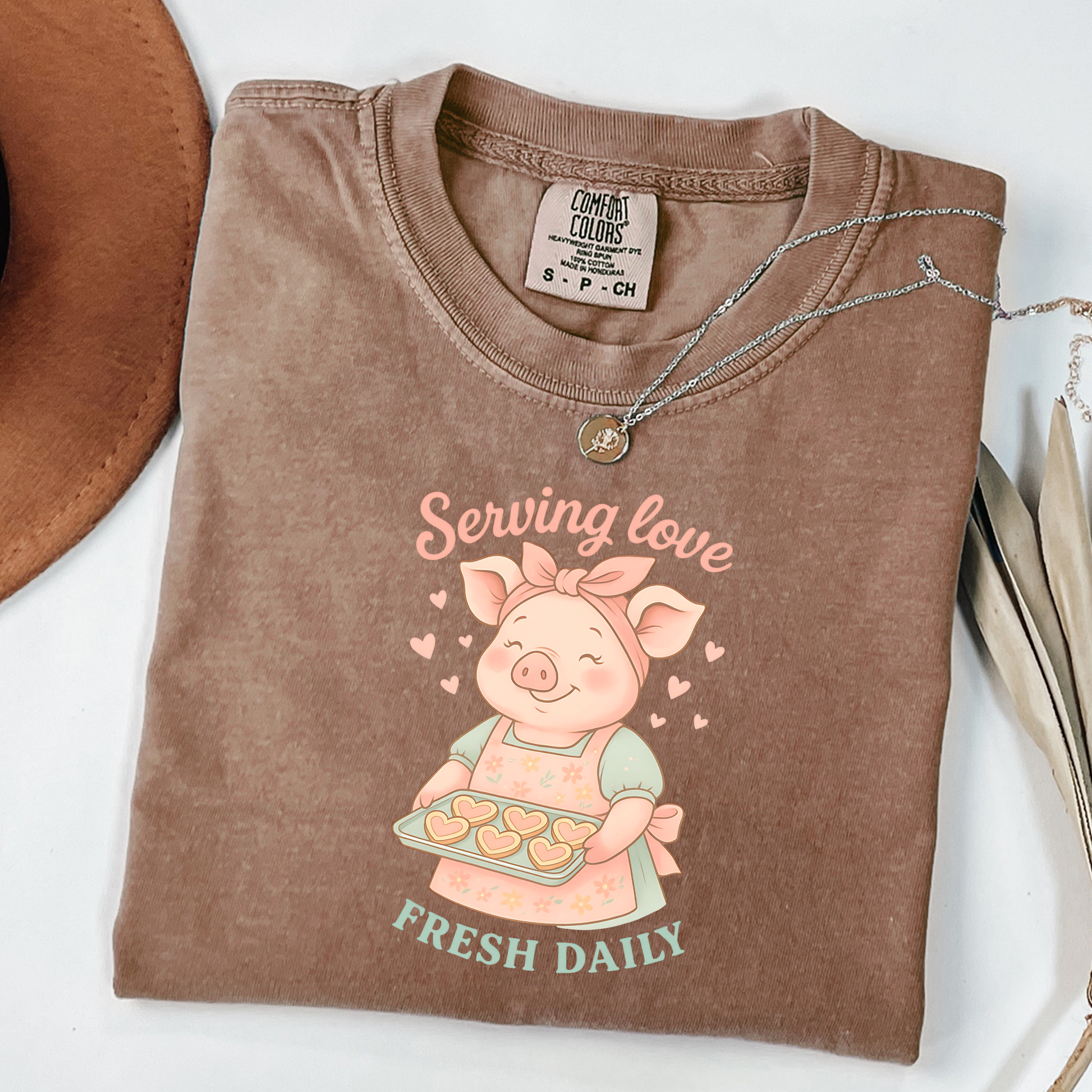 Our “Serving Love Fresh Daily” Pig T-Shirt features an adorable pastel pig in a floral apron, baking heart-shaped cookies with the sweetest smile. It’s the perfect blend of cozy, cute, and country-chic for animal lovers, moms, and anyone who bakes love into everything they do.