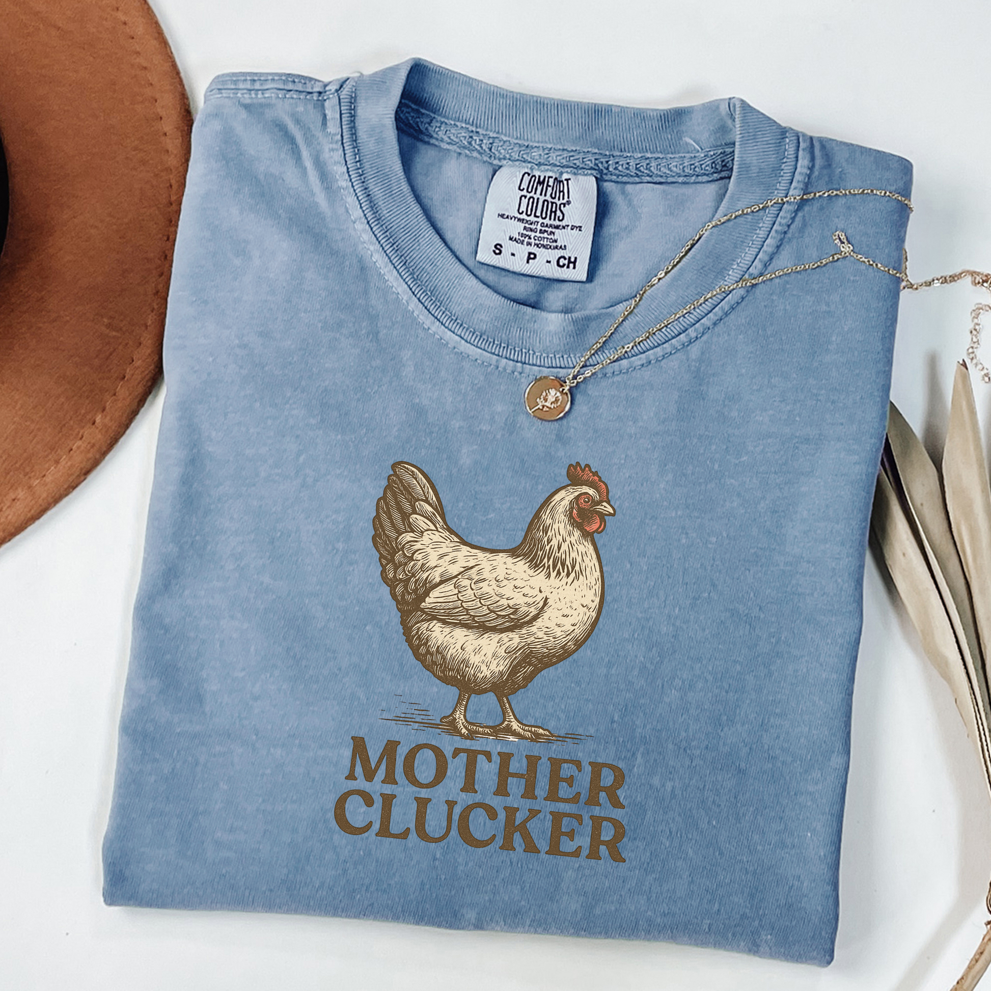 ✅ Bold “Mother Clucker” quote in vintage serif font